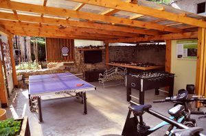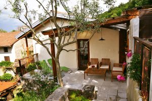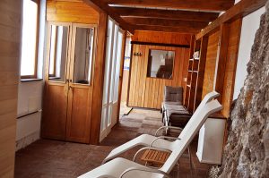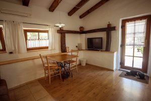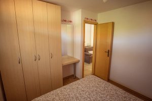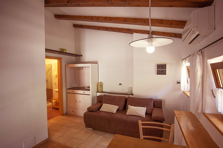 Spalnica z zakonsko posteljo; kopalnica s tušem in sušilcem za lase; hladilnik, dnevni prostor s kavčem, LCD-televizor, brezžični internet, klima, terasa z mizo, ležalniki, bazen, savna